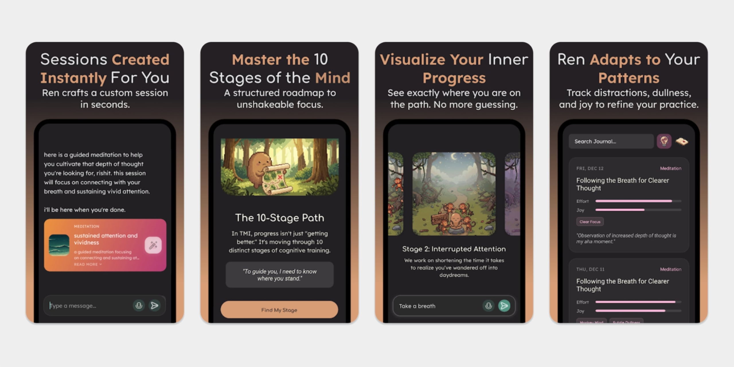 Ren использует искусственный интеллект для создания персональных медитативных сессий. Вместо готовых плейлистов приложение ведёт диалог с пользователем. Практики формируются с учётом текущего состояния и целей. Это делает процесс более осмысленным и гибким.